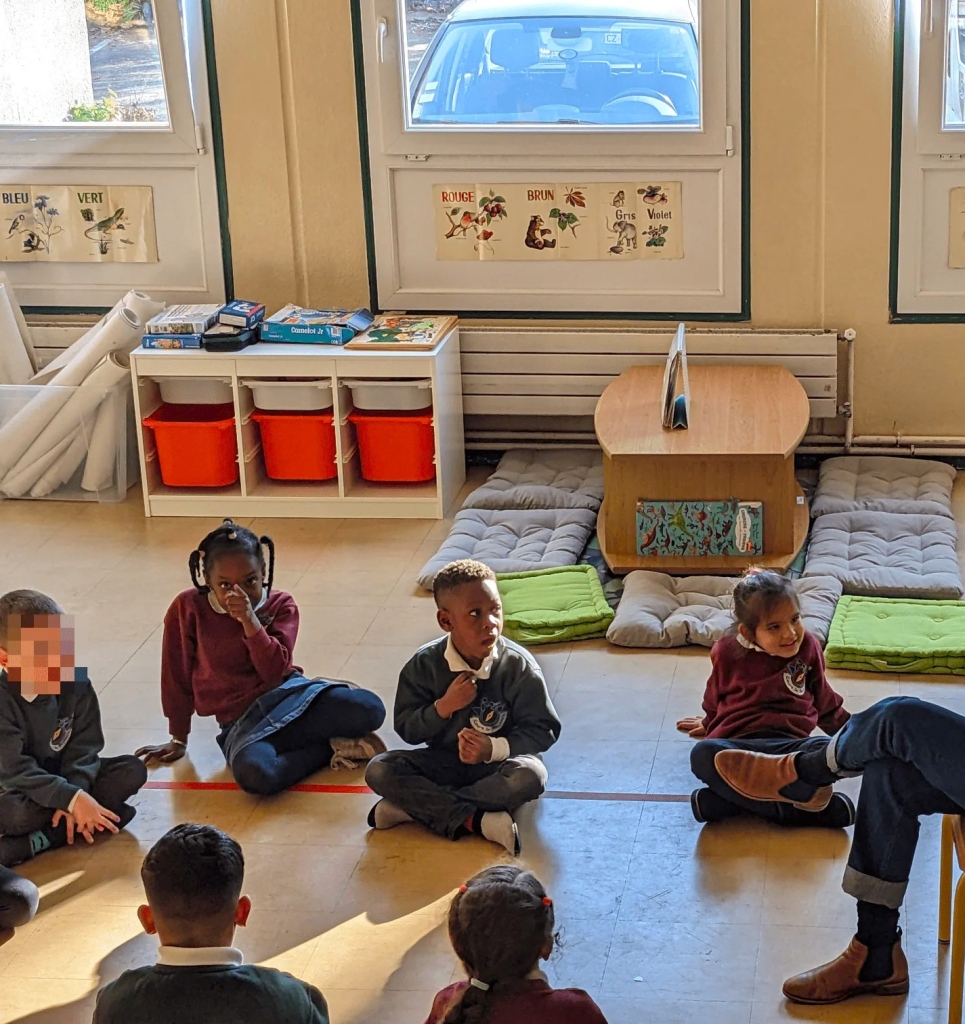 « En parallèle du travail de collaboration avec sa maman pour le mettre en confiance, j’ai instauré un rituel pour réciter les poèmes. Cela consistait à faire asseoir les élèves sur une « ligne Montessori » tracée sur le sol pour s’écouter à tour de rôle. L’objectif était d’engager les élèves dans l’apprentissage et de s’encourager mutuellement. »
